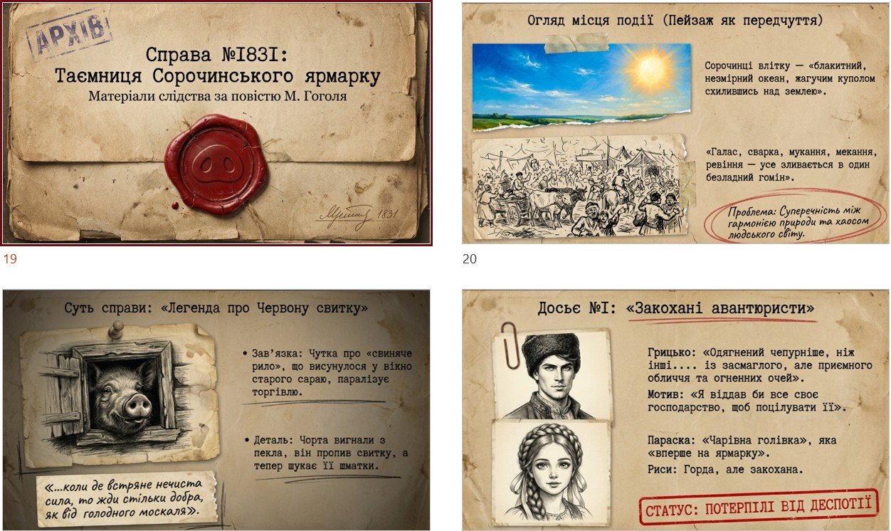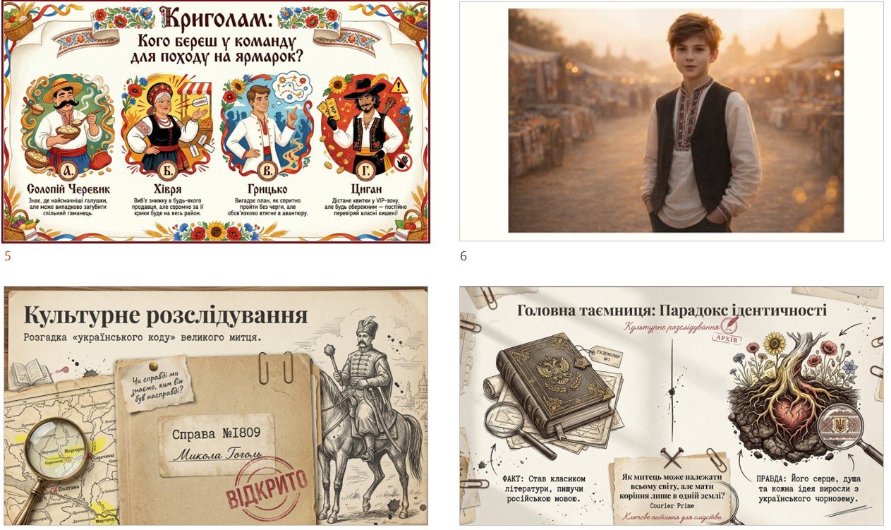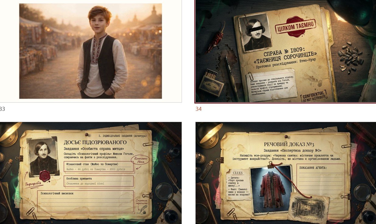 БЛОК № 1: мета “Секретна місія: розгадати код Гоголя”, очікувані результати, криголам “Кого береш у команду для походу на ярмарок?”. “СПРАВА № 1809!: культурне розслідування, парадокс ідентичності, докази, досьє на письменника, “секретні архіви”, “лабораторний” аналіз, метафора дерева, вердикт “Шеф-кухар епохи.