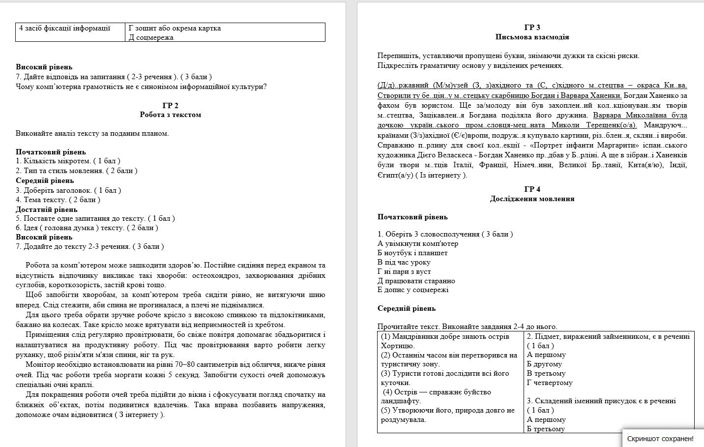 3. Письмова взаємодія: орфографічно-пунктуаційне відновлення тексту, синтаксичний аналіз.