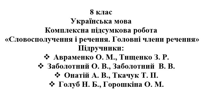 Як купити матеріал «8 клас. Українська мова. Комплексна підсумкова робота “Словосполучення і речення. Головні члени речення” ( підручники Авраменка, Заболотних, Голуб, Он»?