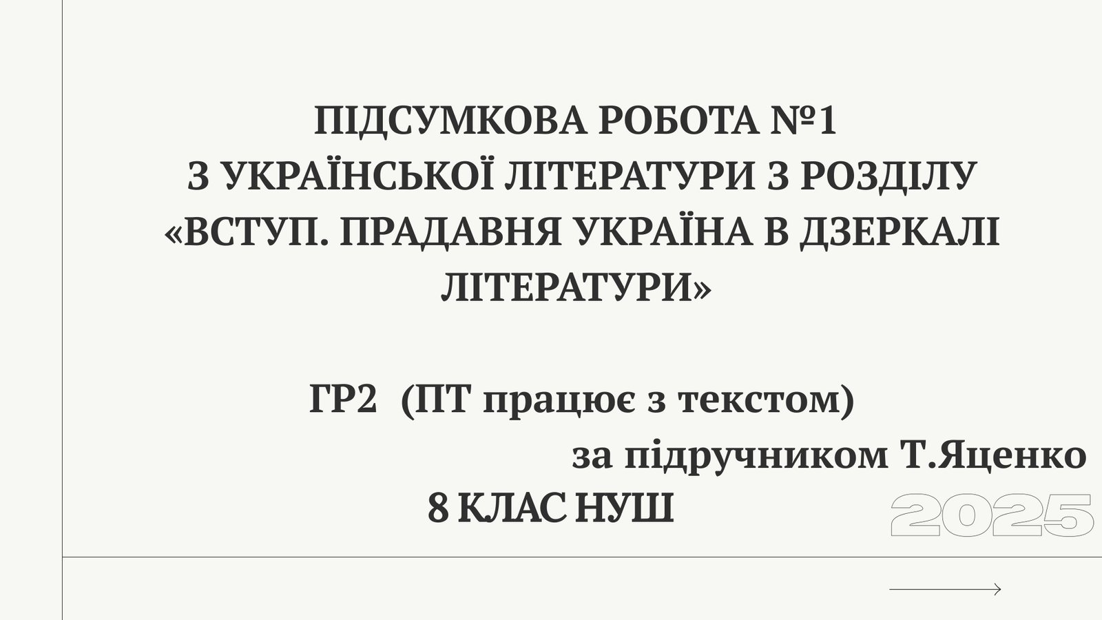 Матеріали «8 НУШ Підсумкова робота №1 з української літератури з розділу «Вступ. Прадавня Україна в дзеркалі літератури» ГР2 (ПТ) (за підручником Т. Яценко)» будуть надіслані в електронному вигляді на вашу поштову скриньку одразу після оплати.