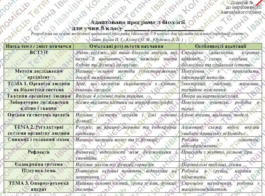 Адаптована навчальна програма “Біологія. 8 клас” НУШ (на основі модельної програми ав...