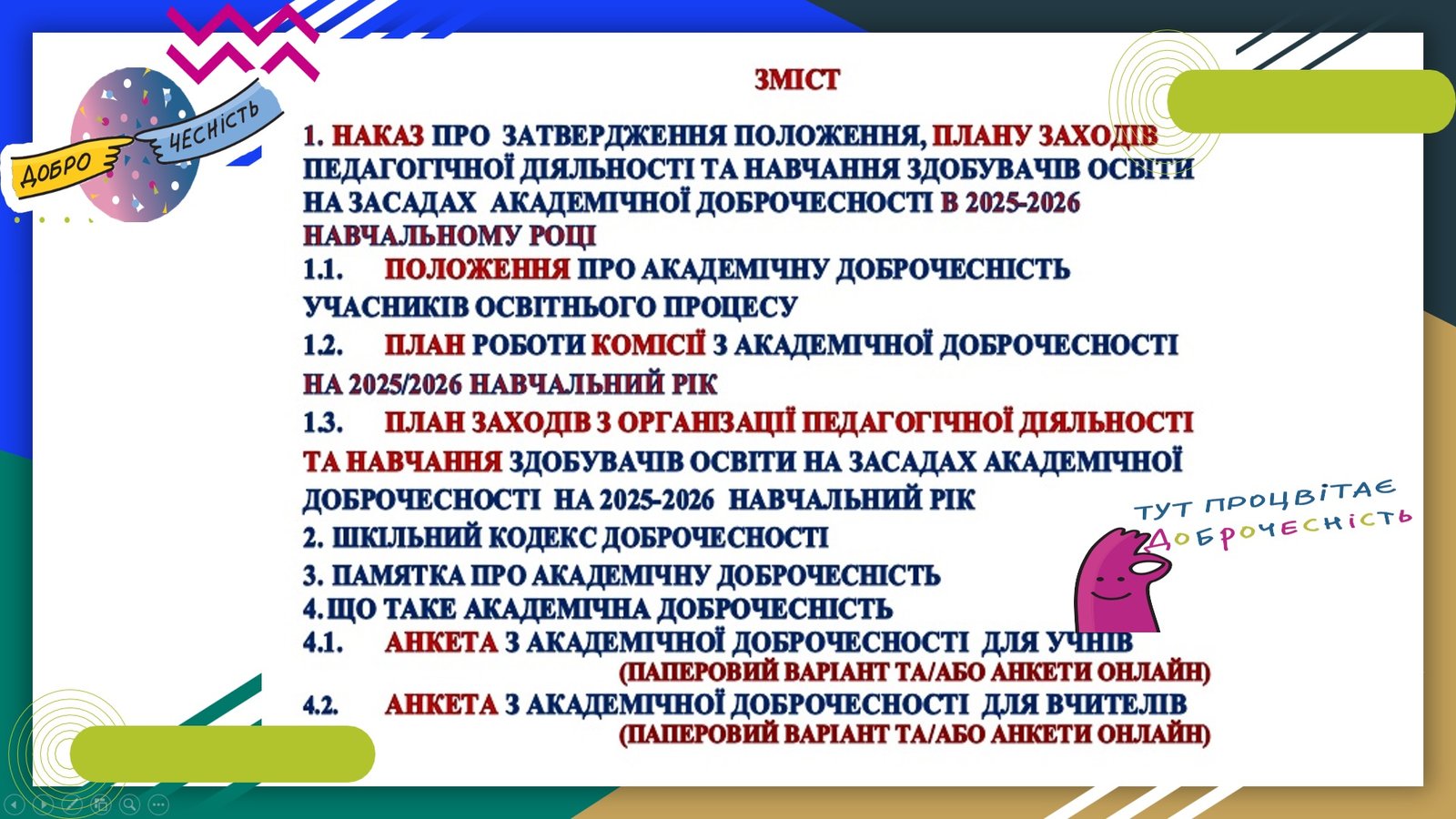 1. НАКАЗ ПРО ЗАТВЕРДЖЕННЯ ПОЛОЖЕННЯ, ПЛАНУ ЗАХОДІВ ПЕДАГОГІЧНОЇ ДІЯЛЬНОСТІ ТА НАВЧАННЯ ЗДОБУВАЧІВ ОСВІТИ НА ЗАСАДАХ АКАДЕМІЧНОЇ ДОБРОЧЕСНОСТІ В __________________ ЗАКЛАДІ ОСВІТИ 1.1. ПОЛОЖЕННЯ ПРО АКАДЕМІЧНУ ДОБРОЧЕСНІСТЬ УЧАСНИКІВ ОСВІТНЬОГО ПРОЦЕСУ 1.2. ПЛАН РОБОТИ КОМІСІЇ З АКАДЕМІЧНОЇ ДОБРОЧЕСНОСТІ НА 2023/2024 Н.Р. 1.3. ПЛАН ЗАХОДІВ З ОРГАНІЗАЦІЇ ПЕДАГОГІЧНОЇ ДІЯЛЬНОСТІ ТА НАВЧАННЯ ЗДОБУВАЧІВ ОСВІТИ НА ЗАСАДАХ АКАДЕМІЧНОЇ ДОБРОЧЕСНОСТІ НА 2023-2024 Н.Р. 2. ШКІЛЬНИЙ КОДЕКС ДОБРОЧЕСНОСТІ 3. ПАМЯТКА ПРО АКАДЕМІЧНУ ДОБРОЧЕСНІСТЬ 4. ЩО ТАКЕ АКАДЕМІЧНА ДОБРОЧЕСНІСТЬ 4.1. АНКЕТА З АКАДЕМІЧНОЇ ДОБРОЧЕСНОСТІ ДЛЯ УЧНІВ (ПАПЕРОВИЙ ВАРІАНТ ТА) 4.2. АНКЕТА З АКАДЕМІЧНОЇ ДОБРОЧЕСНОСТІ ДЛЯ ВЧИТЕЛІВ (ПАПЕРОВИЙ ВАРІАНТ)