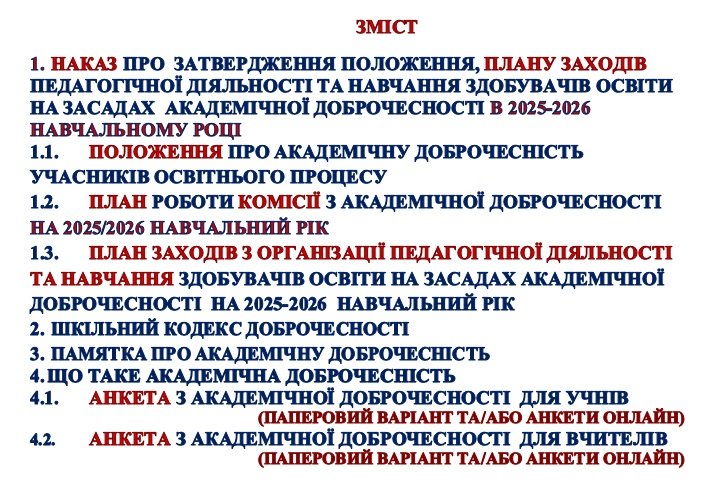 АКАДЕМІЧНА ДОБРОЧЕСНІСТЬ. ОРГАНІЗАЦІЯ РОБОТИ ІЗ ЗАБЕЗПЕЧЕННЯ АКАДЕМІЧНОЇ ДОБРОЧЕСНІСТІ В ЗАКЛАДІ ОСВІТИ на 2025-2026 НАВЧАЛЬНИЙ РІК