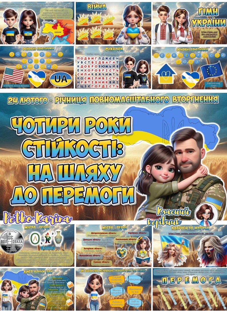 Пропоную до вашої уваги анімовану інформаційно-ігрову презентацію “Чотири роки стійкості: на шляху до перемоги” до 24 лютого – четвертої річниці повномасштабного вторгнення рф в Україну. Презентація містить 54 слайда: