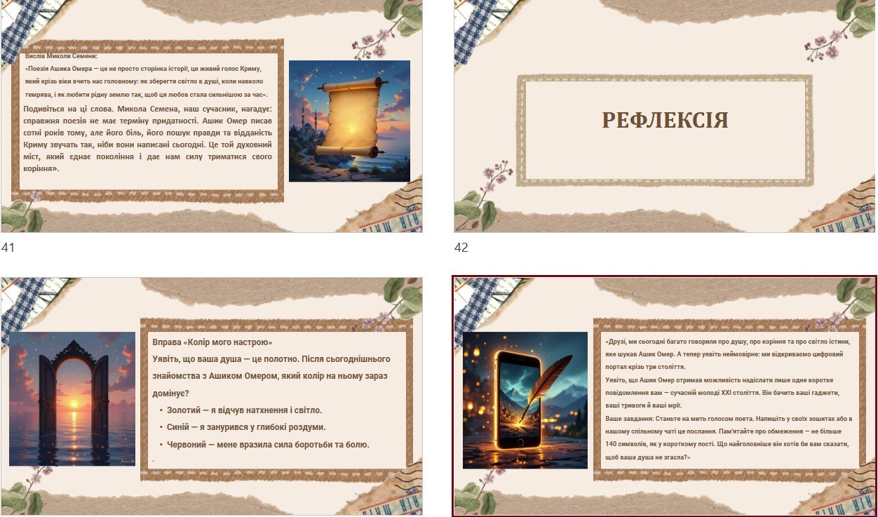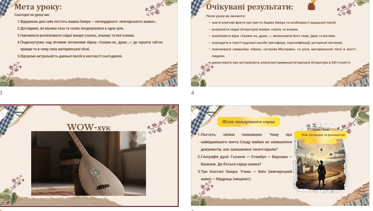 - Тема, епіграф, мета уроку, очікувані результати, WOW-хук (емоційний гачок на початку уроку – медитація під звучання саза), біографія поета “Шлях мандрівного серця”, відеоогляд “Загублений поет Криму” – розповідь про Омера Ашика у вигляді вбудованого цікавого візуалізованого відеопереказу!!!!!), огляд кримськотатарської літератури та її жанрів (газель та кошма), літературний детектив (розпізнай жанри), про поезію Омера Ашика;