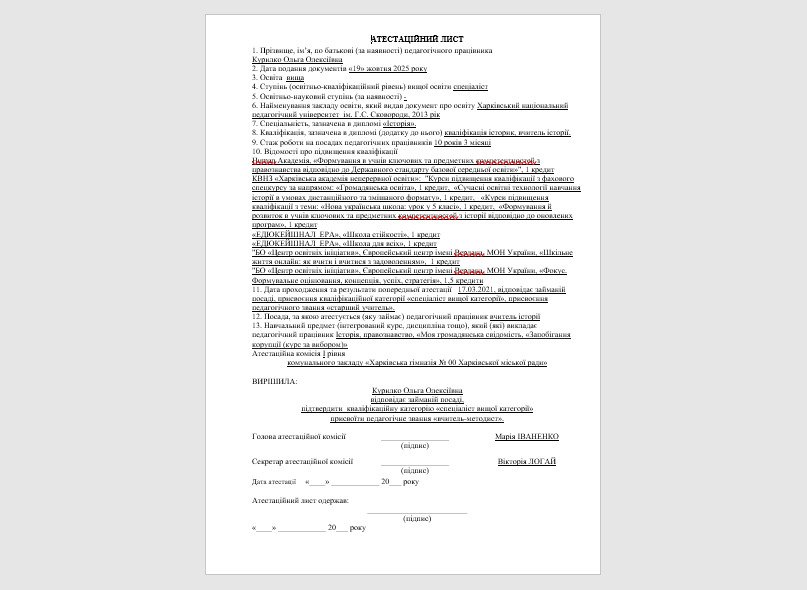 Атестаційний лист 2025/2026 н. р. Зразок за новим положенням про атестацію