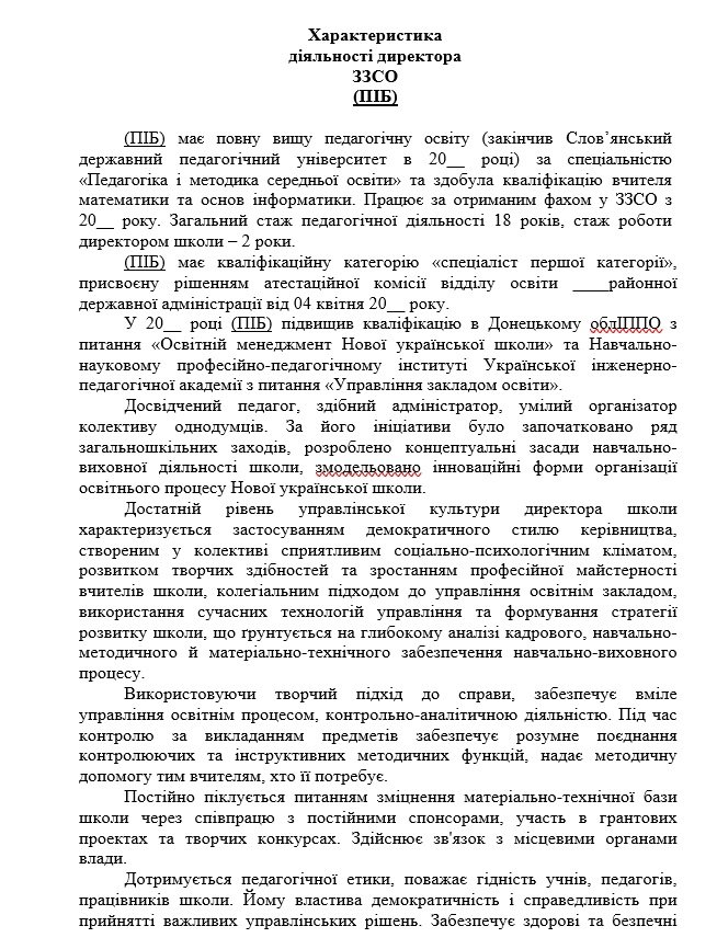 Характеристика діяльності директора школи (атестація) у міжатестаційний період; кваліфікаційна категорія «спеціаліст першої категорії», який атестується атестаційною комісією відділу освіти на відповідність займаної посади