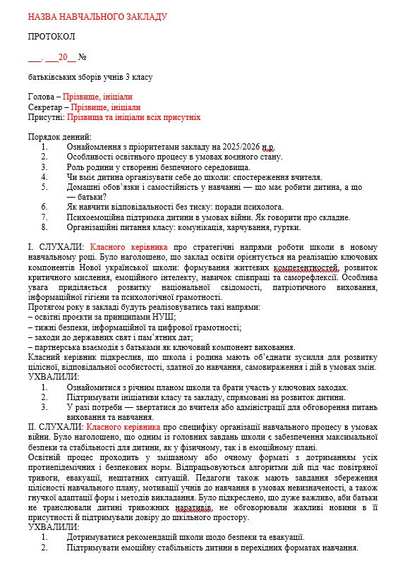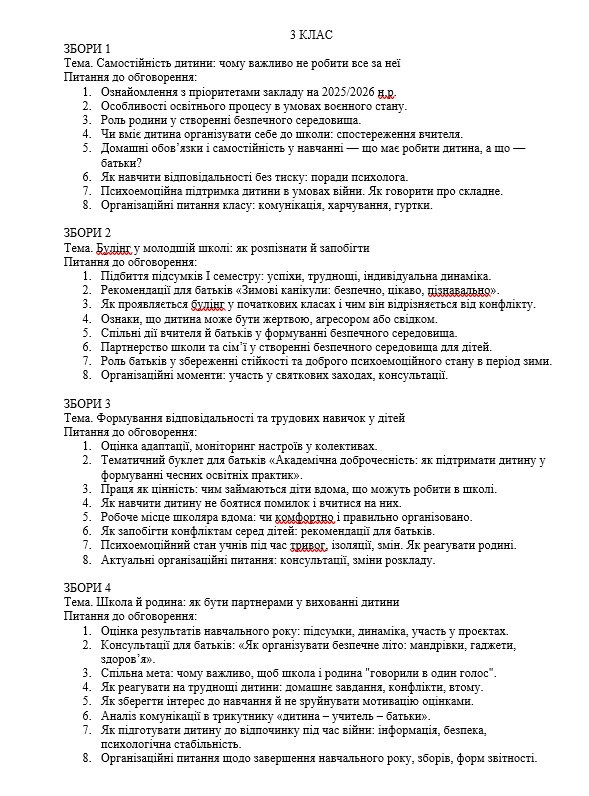 Тематика 4 батьківських зборів на 2025/2026 навчальний рік + протоколи. У кожних зборах – 8 продуманих питань для обговорення (безпека, ментальне здоров’я, організаційні моменти та ін.)