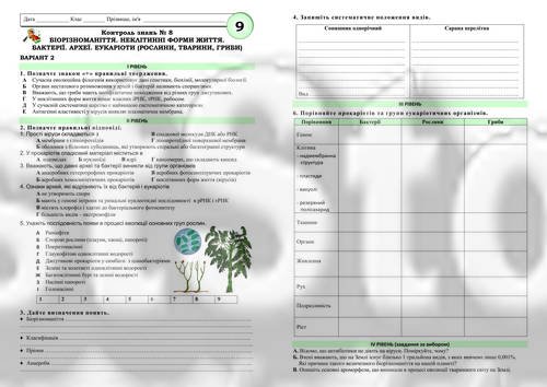 !!! БІОЛОГІЯ 9 КЛ. КОНТРОЛЬНА РОБОТА “БІОРІЗНОМАНІТТЯ. НЕКЛІТИННІ ФОРМИ ЖИТТЯ. БАКТЕРІЇ. АРХЕЇ. ЕУКАРІОТИ” (ТРИ ВАРІАНТИ, ЧОТИРИ РІВНІ СКЛАДНОСТІ)