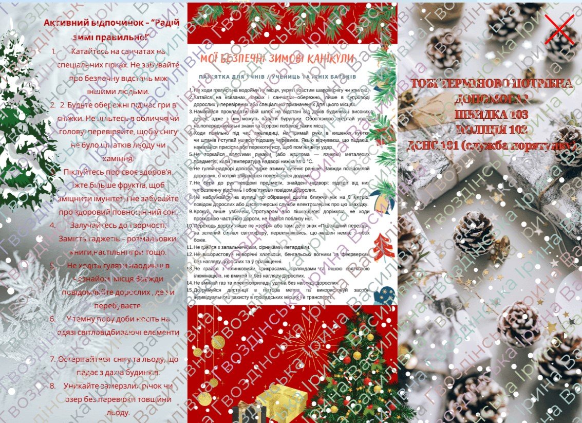 Зимові канікули — пора відпочинку, свят та розваг. Але для того, щоб не трапилось біди, необхідно пам’ятати про правила безпеки. Для проведення інструктажу щодо безпечної поведінки під час зимових канікул пропоную для ваших учнів буклет-пам’ятку.