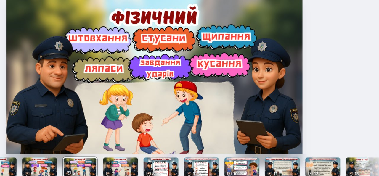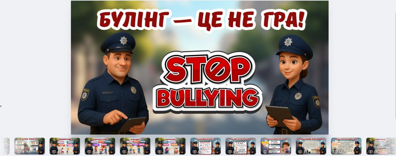 У презентації розкрито поняття булінгу в доступній для молодших школярів формі, подано його основні види, наслідки та шляхи запобігання. Матеріал супроводжується короткими висловами, порадами, прикладами добрих учинків і позитивними гаслами. Мета презентації — формування у дітей початкових класів навичок доброзичливого спілкування, поваги одне до одного та нетерпимості до будь-яких проявів насильства чи образ.