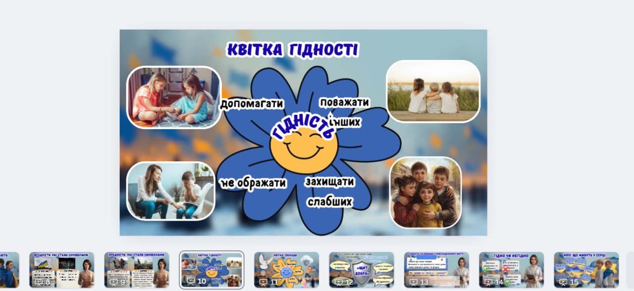 - Ігрові та рефлексійні вправи: Гідно чи негідно, чарівні слова, хмаринка слів
