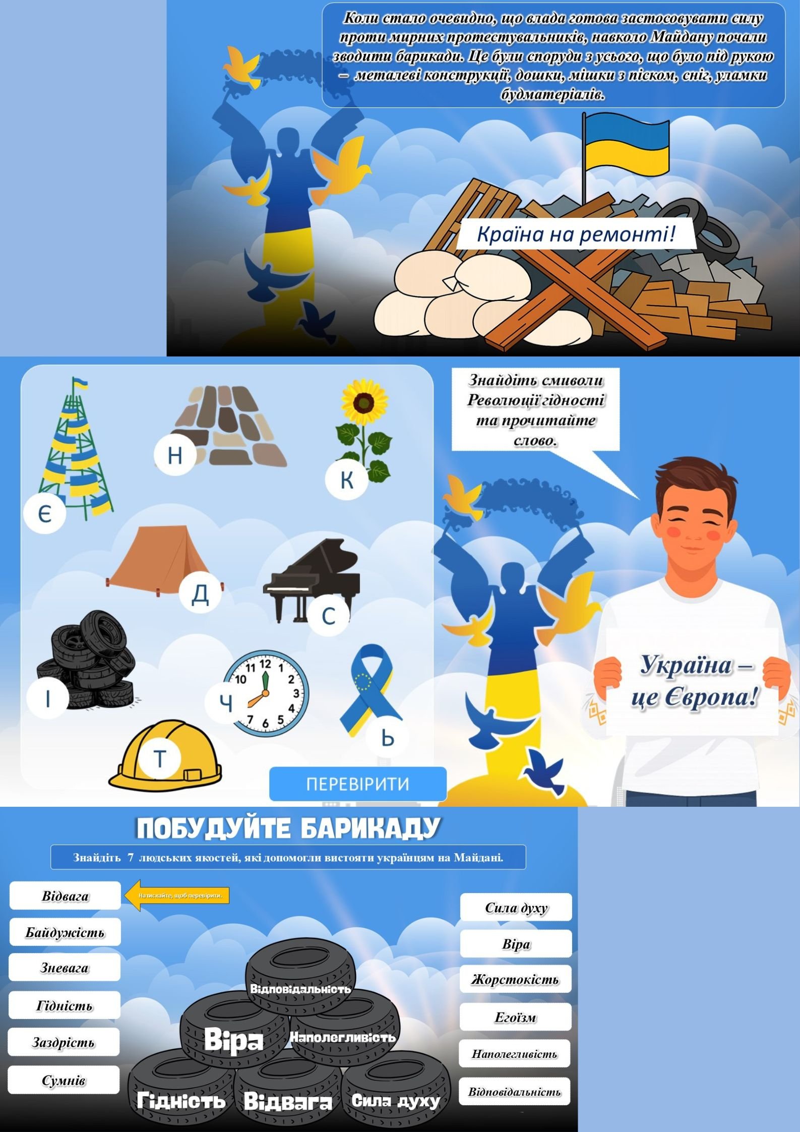 - інтерактивні завдання, що допомагають учням усвідомити цінність гідності, свободи, єдності.