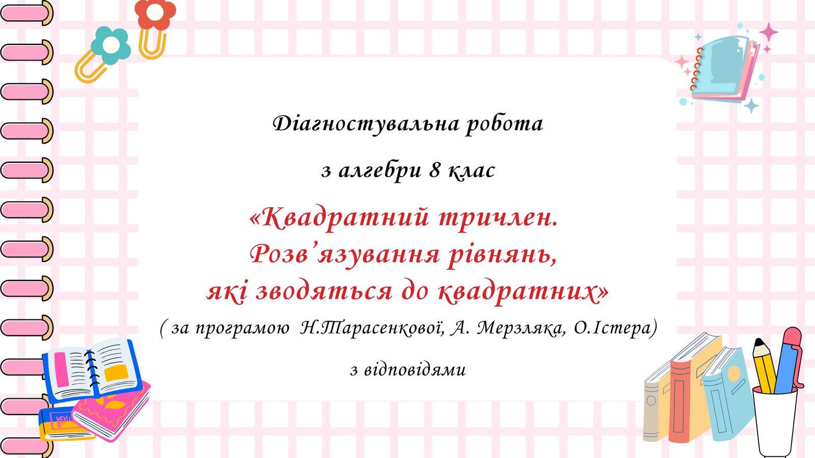 Діагностувальна робота за групами результатів з алгебри 8 клас ” Квадратний тричлен. Розв’язування рівнянь, які зводяться до квадратних ” з відповідями за програмою О.Істера, Н.Тарасенкової, А. Мерзляка