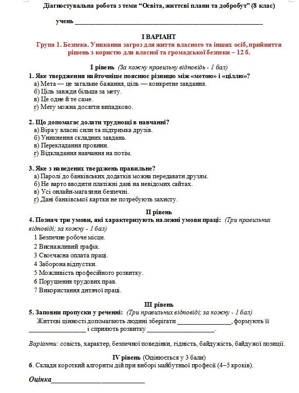 Коли я отримаю матеріал «Діагностувальна робота №2. Освіта, життєві плани та добробут. Здоров’я, безпека та добробут. 8 клас. Гр.1. Гр.2. Гр.3. Чотири рівні завдань. Два варіа»?