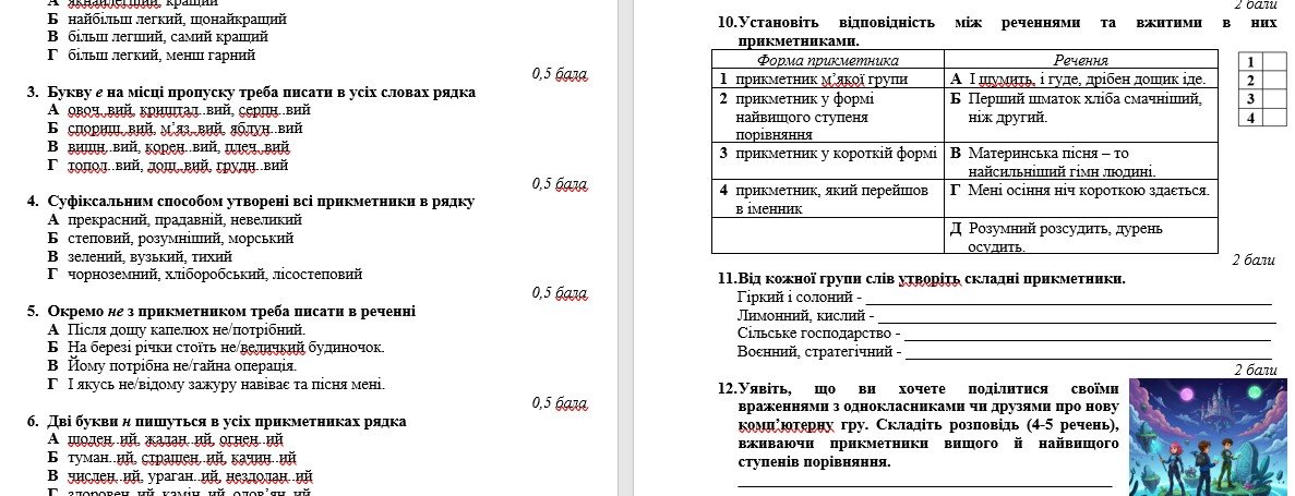 Підсумкова робота з української мови за ГР 4 “Досліджує мовлення” розроблена для учнів 6 класу, які вивчили тему “Прикметник як частина мови” (модельна навчальна програма «Українська мова. 5-6 класи» для закладів загальної середньої освіти (автори: Заболотний О. В., Заболотний В. В., Лавринчук В. П., Плівачук К. В., Попова Т. Д.)).