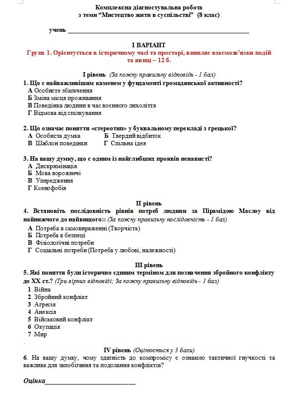 Вашій увазі пропоную діагностувальну роботу в 8-у класі з громадянської освіти до розділу №2 “Мистецтво жити в суспільстві“. Складено відповідно до модельної програми та навчального підручника Васильків І. та ін. З трьома групами результатів (по 12 балів). Робота містить читири рівні завдань (кожен оцінюється в три бали) – дистрактори з вибором однієї правильної відповіді, із вибором трьох правильних відповідей, на встановлення послідовності подій, на встановлення відповідності, робота з термінами і поняттями та із розгорнутою відповіддю. Робота містить два варіанти. З розв’язками для вчителя.