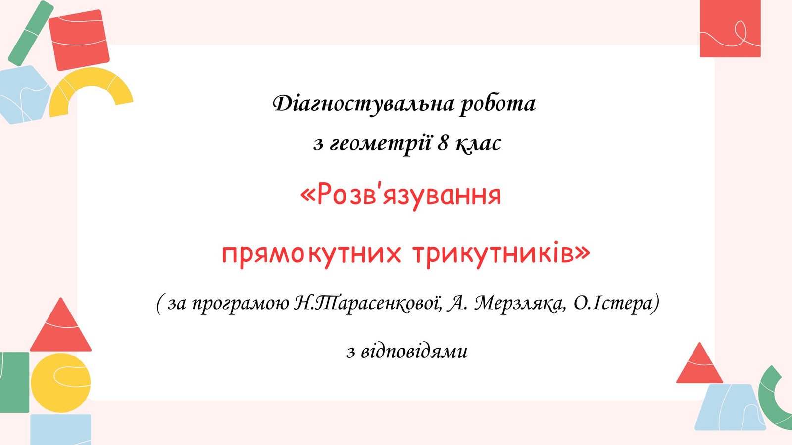 Діагностувальна робота за групами результатів 8 клас “Розв’язування прямокутних трикутників” з відповідями за програмою О.Істера, Н.Тарасенкової, А. Мерзляка