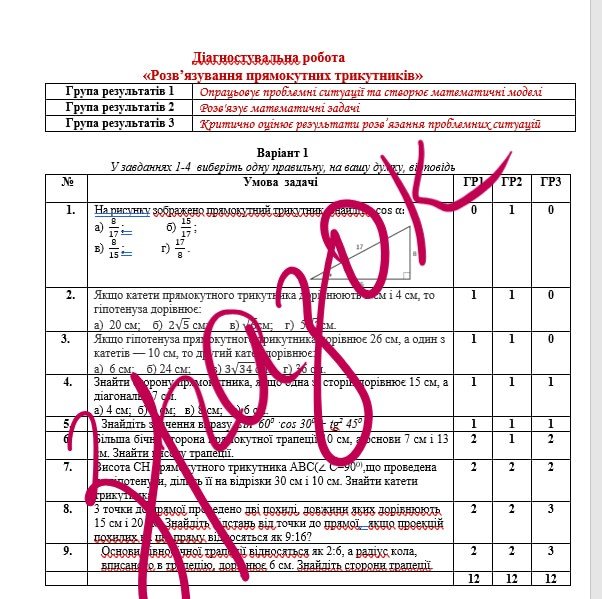 Діагностувальна робота за групами результатів з геометрії 8 клас “Розв’язування прямокутних трикутників” з