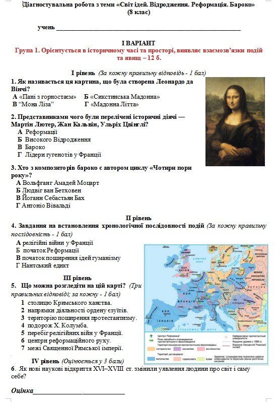 Вашій увазі пропоную діагностувальну роботу в 8-у класі з теми “Світ ідей. Відродження. Реформація. Бароко”. Складено відповідно до підручника з всесвітньої історії авторів Пометун О. та ін. Робота містить читири рівні завдань, складені за принципом ЗНО і НМТ – дистрактори з вибором однієї правильної відповіді, із вибором трьох правильних відповідей, на встановлення послідовності подій, на встановлення відповідності, заповнення порівняльної таблиці і з розгорнутою відповіддю. Завдання складені з урахуванням наказу МОН від 02.08.2024 № 1093. Робота містить два варіанти. З відповідями для вчителя.