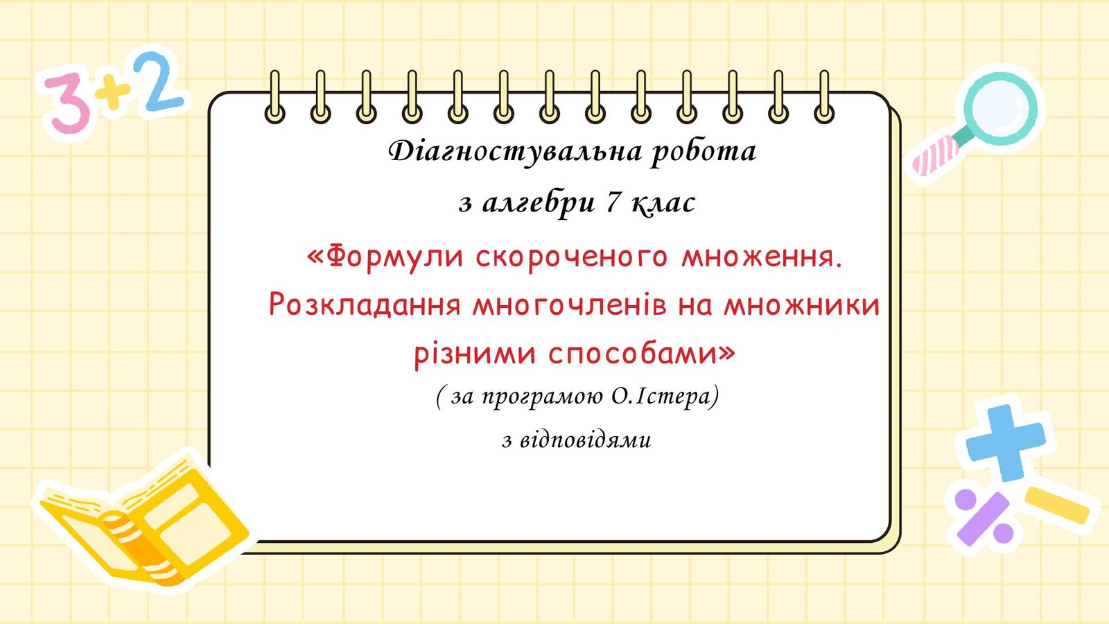 Діагностувальна робота за групами результатів з алгебри 7 клас “Формули скороченого множення. Розкладання многочленів на множники різними способам” з відповідями за програмою О.Істера