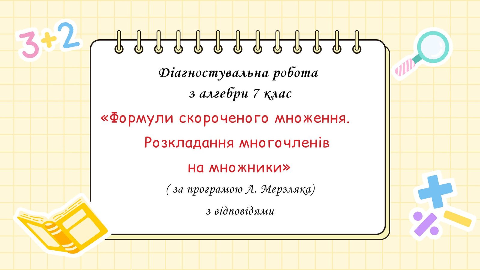 Діагностувальна робота за групами результатів з алгебри 7 клас “Формули скороченого множення. Розкладання многочленів на множники” з відповідями за програмою А. Мерзляка