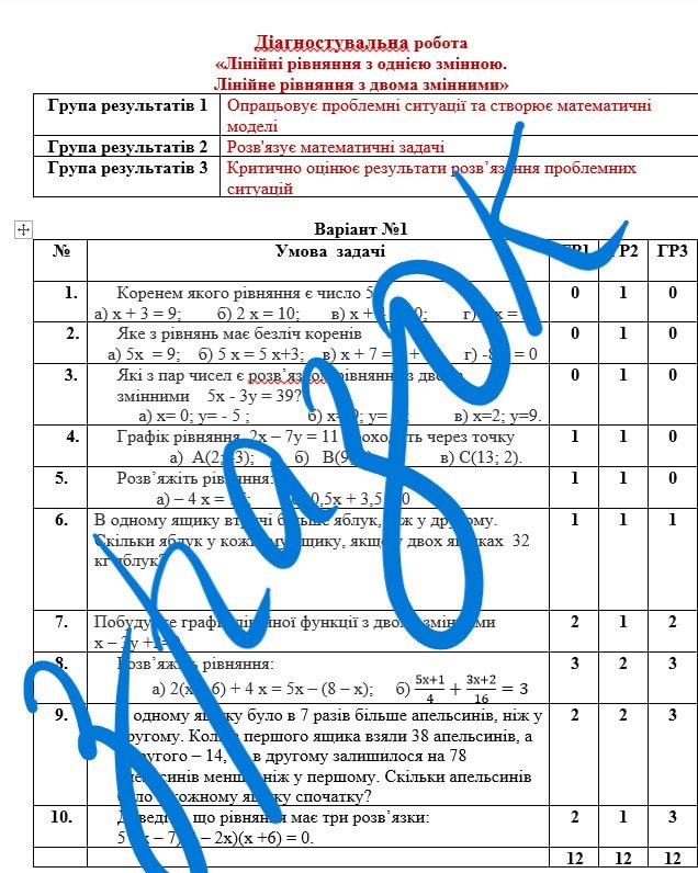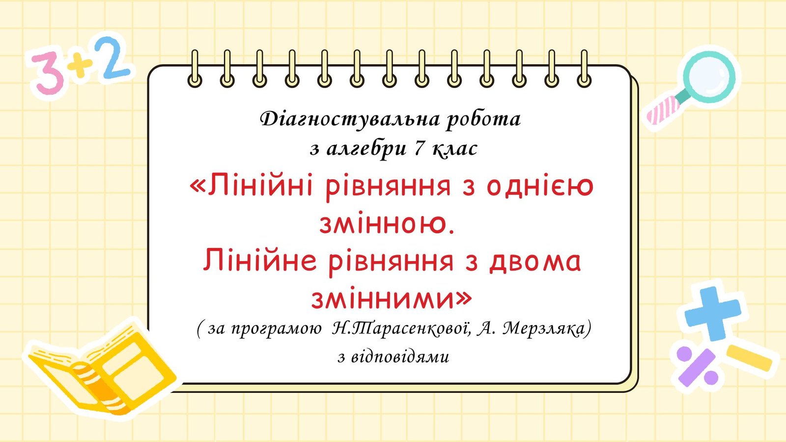 Діагностувальна робота за групами результатів з алгебри 7 клас “Лінійні рівняння з однією змінною. Лінійне рівняння з двома змінними” з відповідями за програмою Н.Тарасенкової, А. Мерзляка