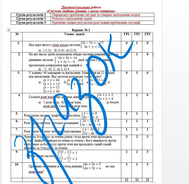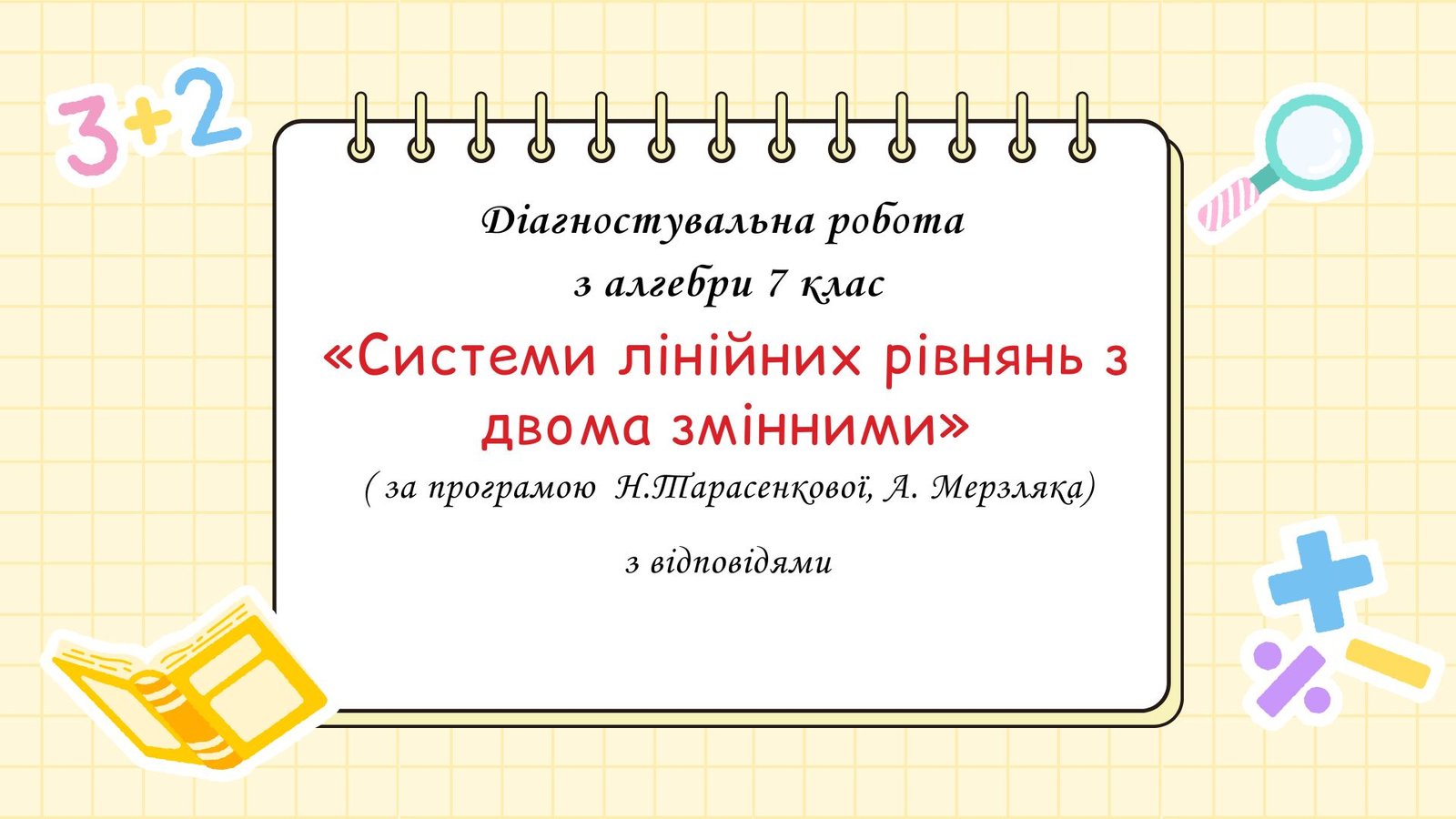 Діагностувальна робота за групами результатів з алгебри 7 клас “Системи лінійних рівнянь з двома змінними” з відповідями за програмою Н.Тарасенкової, А. Мерзляка