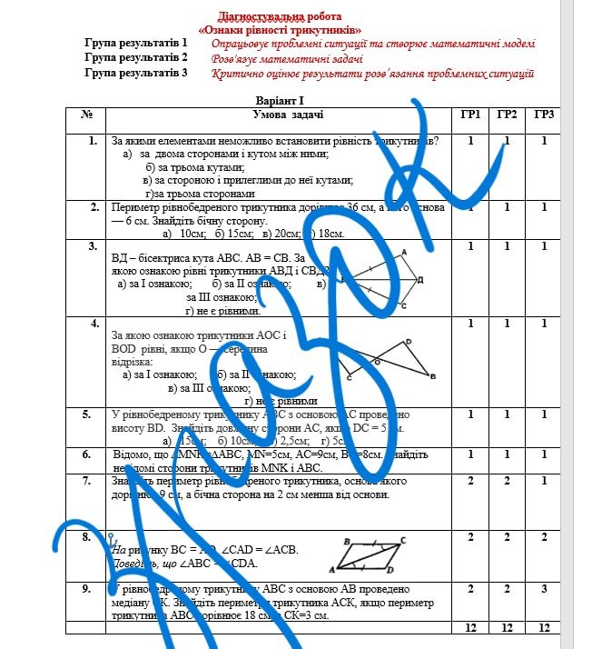 Діагностувальна робота за групами результатів з геометрії 7 клас “Ознаки рівності трикутників” з відповідями за програмою Н.Тарасенкової