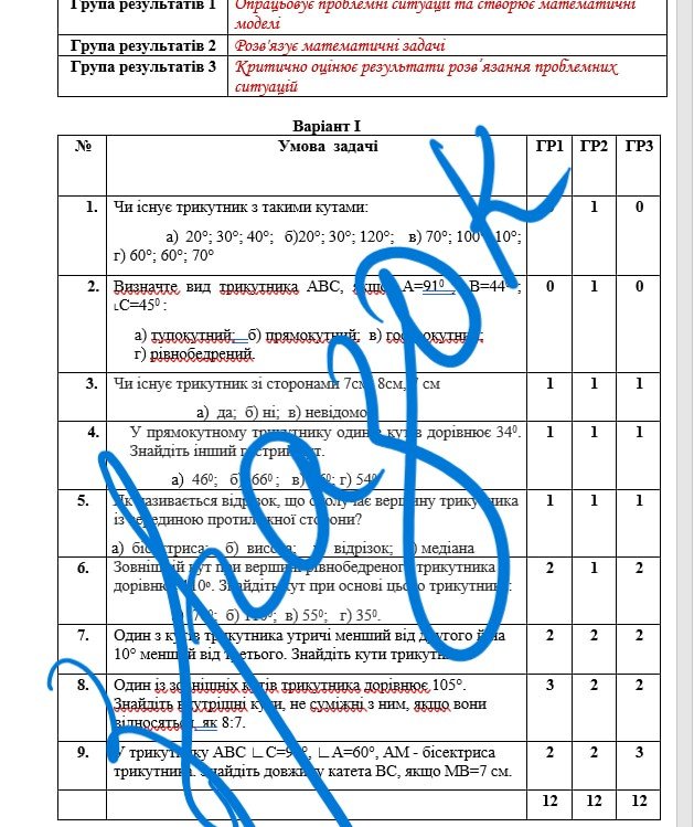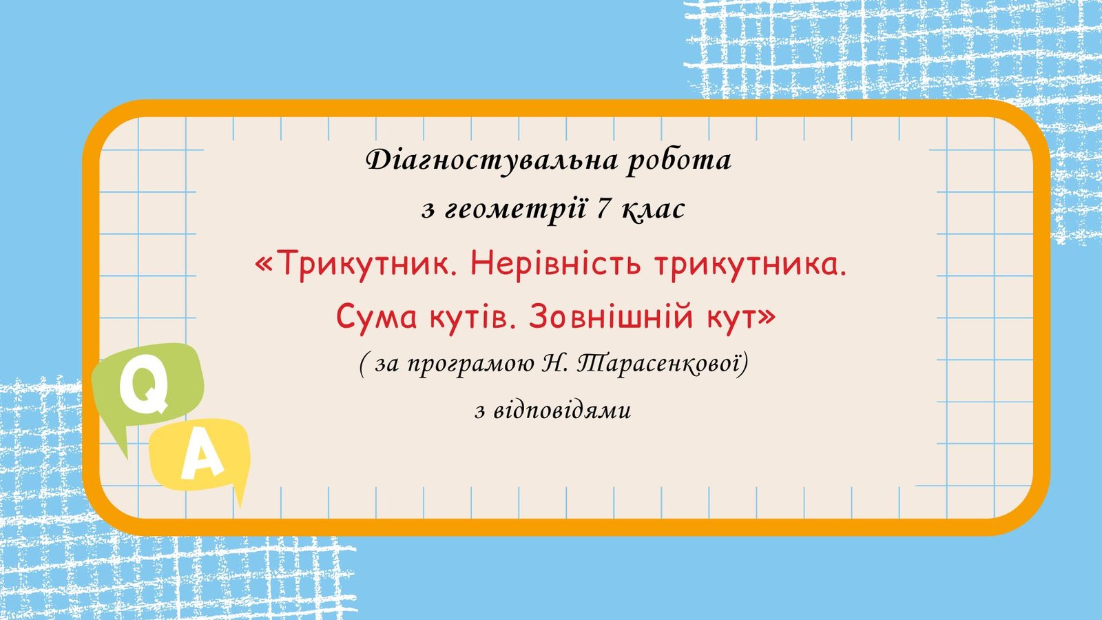 Діагностувальна робота за групами результатів з геометрії 7 клас “Трикутник. Нерівність трикутника. Сума кутів. Зовнішній кут” з відповідями за програмою Н.Тарасенкової