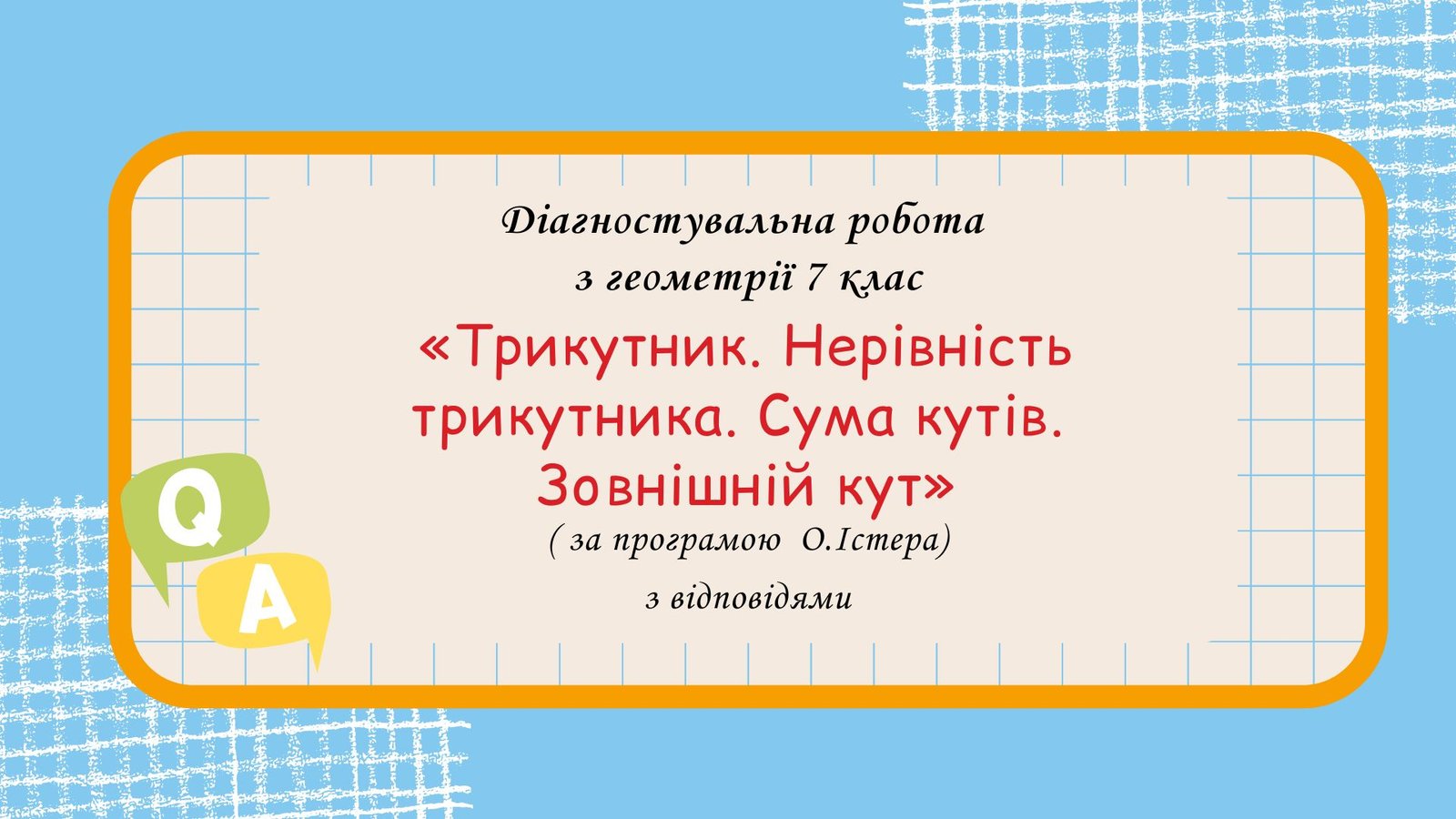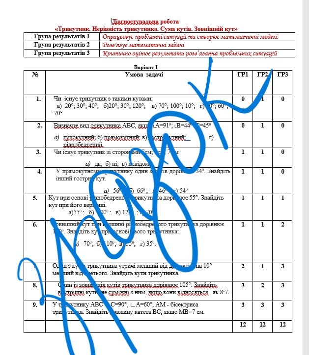 Діагностувальна робота за групами результатів з геометрії 7 клас “Трикутник. Нерівність трикутника. Сума кутів. Зовнішній кут” з відповідями за програмою О. Істера