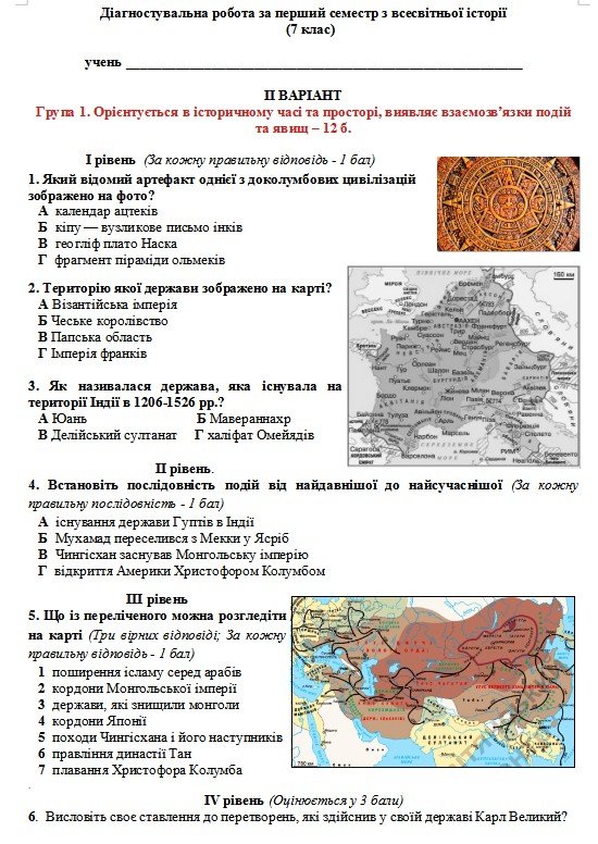 Вашій увазі пропоную діагностувальну роботу в 7-у класі за перший семестр. Складено відповідно до підручника “Всесвітня історія” автора Щупак І. та ін. З трьома групами результатів. Робота містить читири рівні завдань, складені за принципом ЗНО і НМТ – дистрактори з вибором однієї правильної відповіді, із вибором трьох правильних відповідей, на встановлення послідовності подій, на встановлення відповідності, заповнення порівняльної таблиці і з розгорнутою відповіддю. Завдання складені з урахуванням наказу МОН від 02.08.2024 № 1093. Робота містить два варіанти. З відповідями для вчителя.