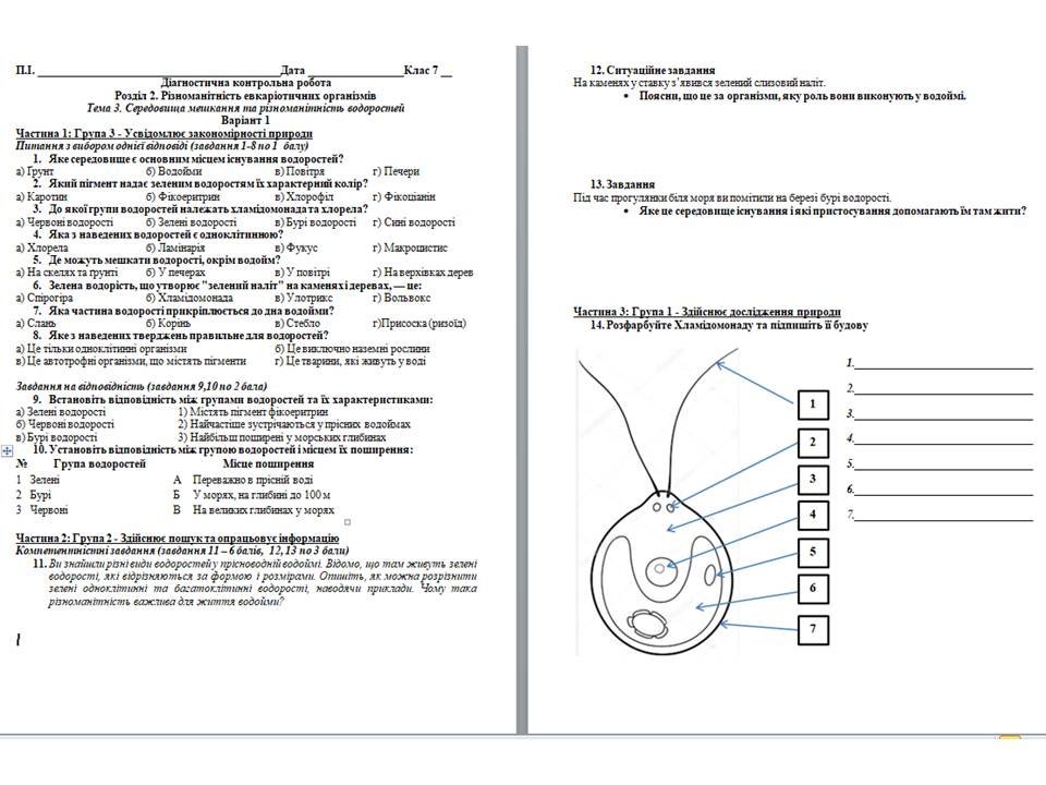 Матеріали «Діагностична контрольна робота 7 клас Розділ 2. Різноманітність евкаріотичних організмів Тема 3. Середовища мешкання та різноманітність водоростей» будуть надіслані в електронному вигляді на вашу поштову скриньку одразу після оплати.