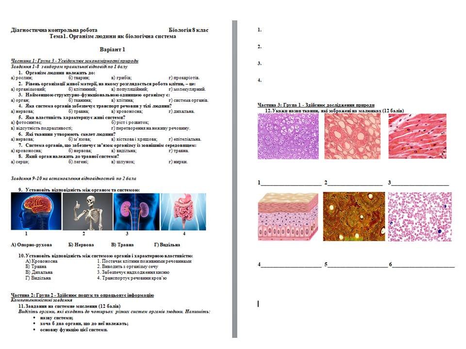 Діагностична контрольна робота Біологія 8 клас НУШ Тема1. Організм людини як біологічна система