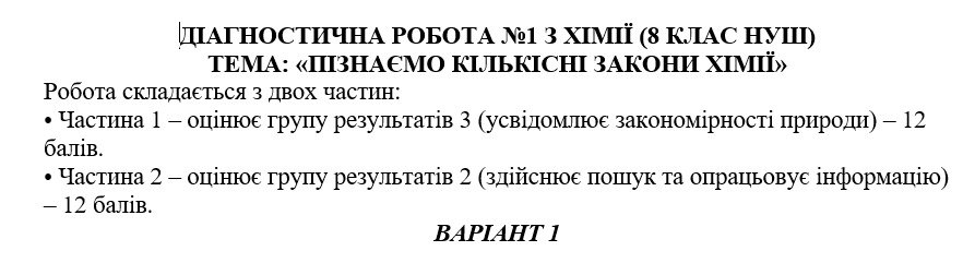 Діагностична робота №1 з хімії для 8 класу НУШ Тема: «Пізнаємо кількісні закони хімії» (за Григоровичем) за групами результатів + відповіді