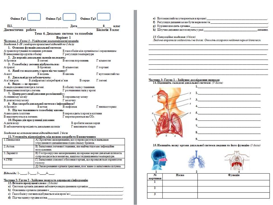 Діагностична робота Біологія 8 клас НУШ Тема 6. Дихальна система та газообмін