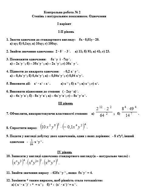 Діагностична робота тема “Одночлени. Степінь одночлена. Множення одночленів” для 7 класу алгебра (у двох варіантах)