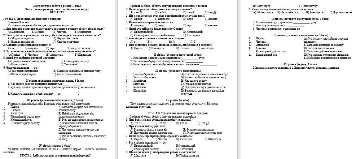 Діагностична робота з фізики 7 клас. Тема: Рівномірний рух по колу. Коливальний рух. Робота містить два варіанти і відповіді до них. Робота розроблена за групами результатів. Кожна група результатів містить завдання чотирьох рівнів.