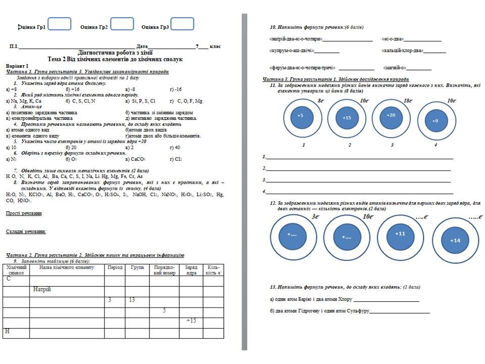 Діагностична робота з хімії 7 клас Тема 2 Від хімічних елементів до хімічних сполук за програмою Григорович