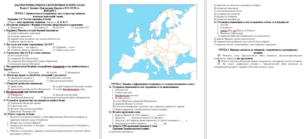 ДІАГНОСТИЧНА РОБОТА З ВСЕСВІТНЬОЇ ІСТОРІЇ З ГР, 8 КЛАС НУШ Розділ 3. Західна і Центральна Європа в ХVІ–ХVІІІ ст.
