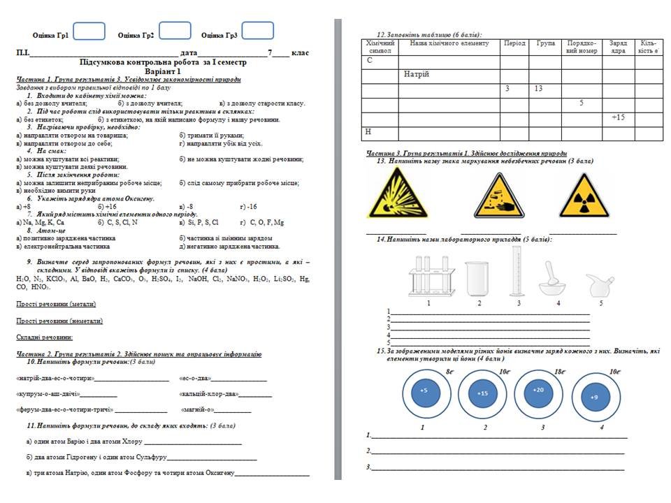 Діагностична робота за І семестр хімія 7 клас (Григорович) з Гр