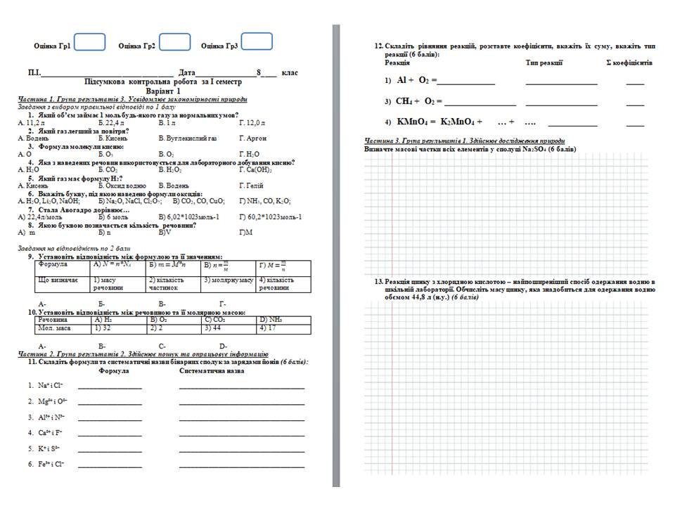 Діагностична робота за І семестр хімія 8 клас (Григорович) з Гр