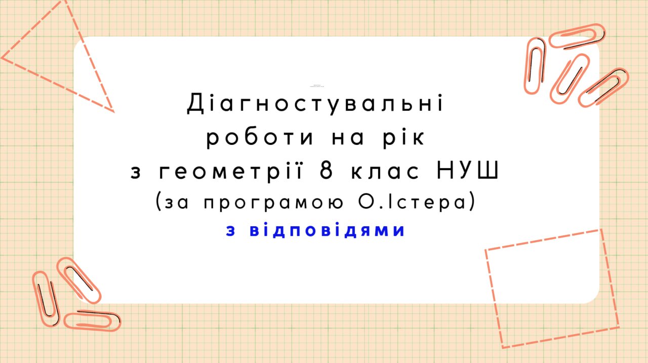 Діагностувальні контрольні роботи на рік з геометрії 8 клас геометрія НУШ за підручником О.Істера. Розраховані на 2 год. Розроблені в вордовському документі в двох варіантах, можна редагувати. В комплекті 6 контрольних робіт. Підсумкова за рік входить в комплект. Також є в інших публікаціях календарне планування з очікуваними результатами та групами результатів.
