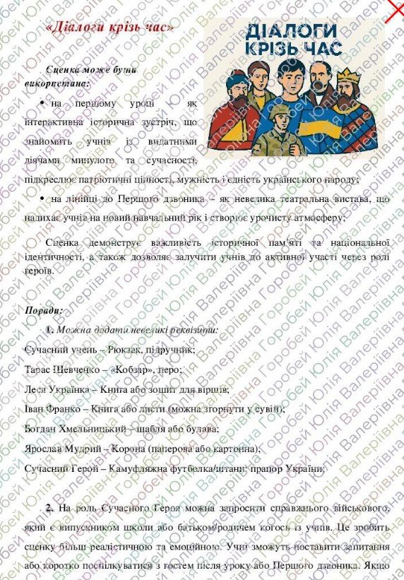 Матеріали ««Діалоги крізь час» – сценарій для першого уроку або лінійки Першого дзвоника» будуть надіслані в електронному вигляді на вашу поштову скриньку одразу після оплати.