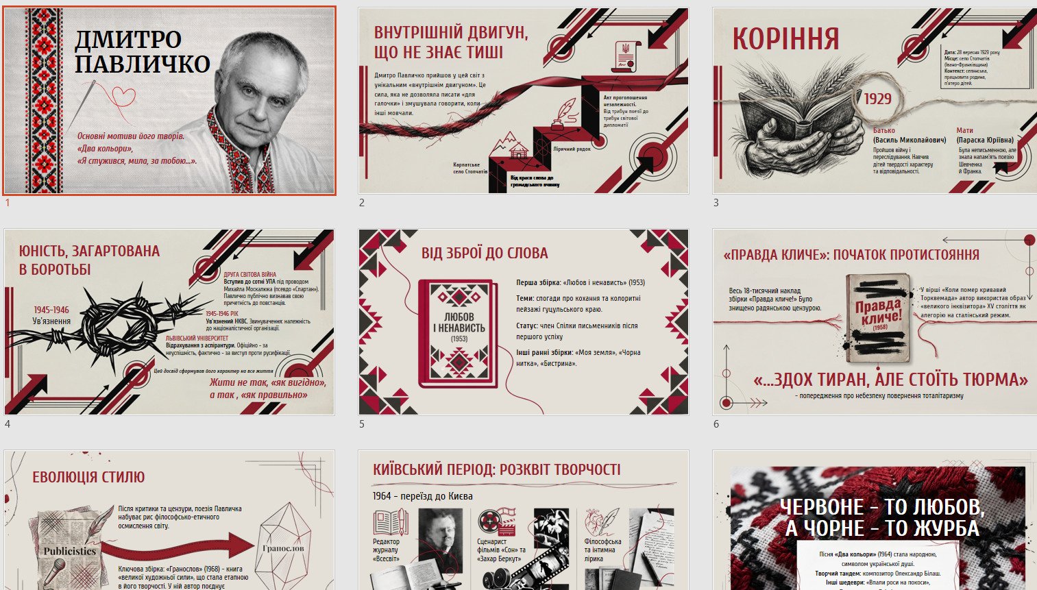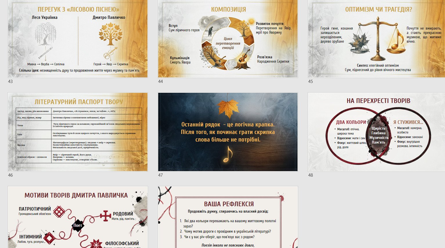 Матеріал подано у сучасному форматі: від біографічних акцентів і громадянської позиції митця — до глибокого текстового аналізу, символіки та художніх засобів. Презентація допомагає учням побачити Павличка як живу людину та поета з характером, який умів говорити правду й бути відповідальним за слово.
