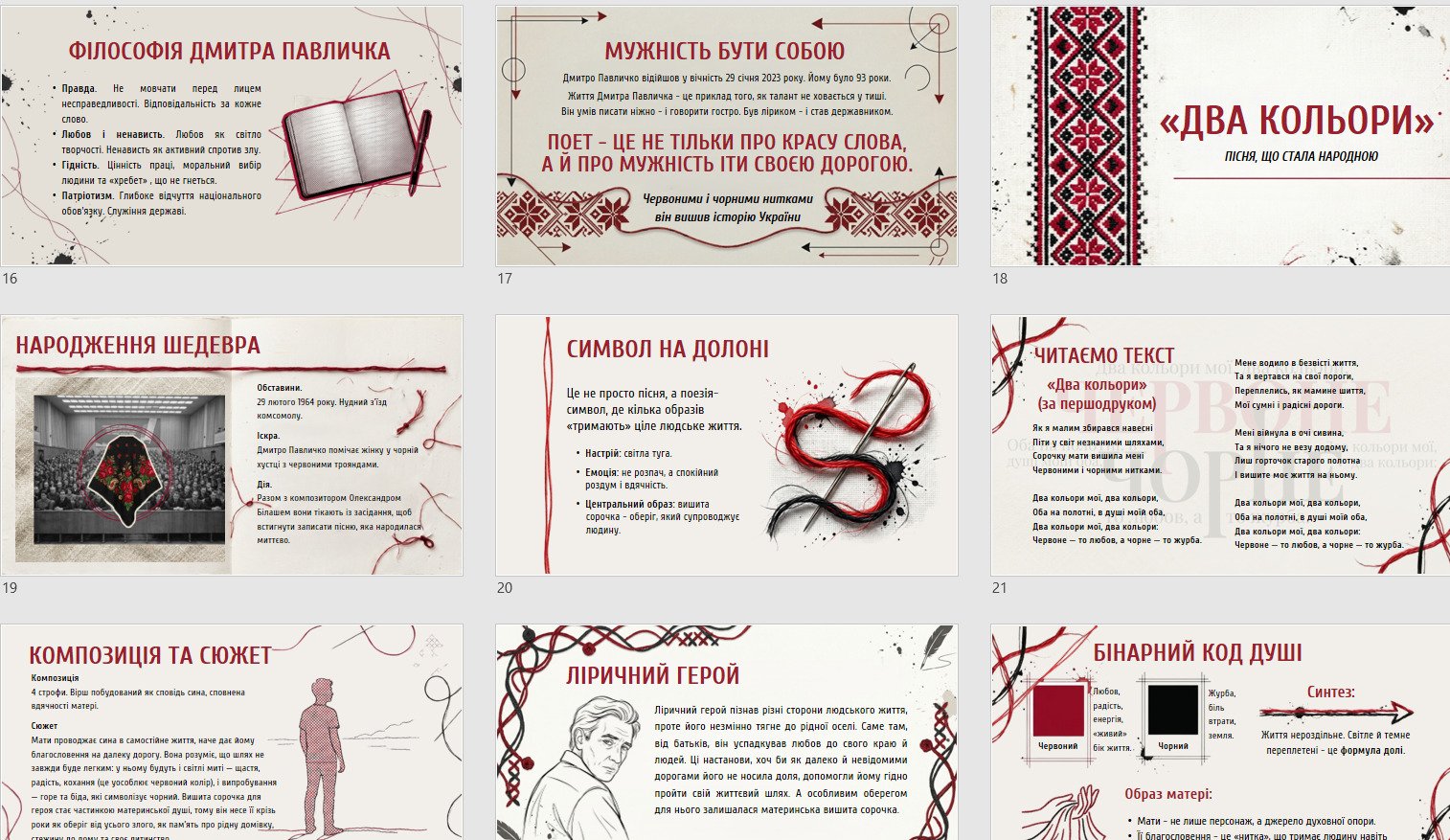 - покроковий аналіз поезії «Два кольори»: історія створення, композиція, сюжет, ліричний герой, мотив дороги, символіка (червоне/чорне, сорочка як оберіг), тема/ідея, художні засоби; літературні паралелі (зокрема перегук із «Піснею про рушник»);
