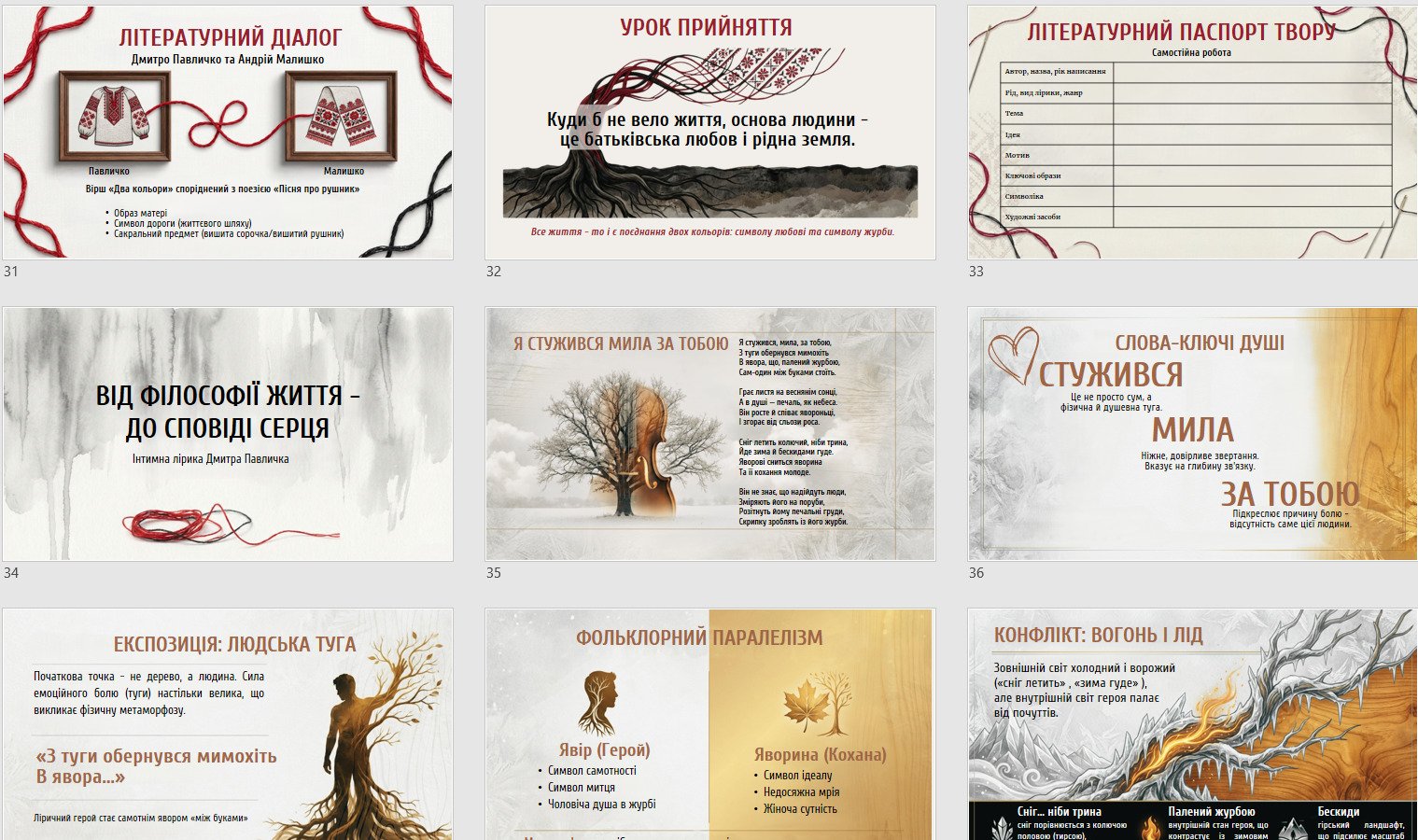 - аналіз інтимної лірики «Я стужився, мила, за тобою…»: ключові образи, фольклорний паралелізм, конфлікт «вогонь і лід», композиція, підсумкова ідея про трансформацію болю в мистецтво;