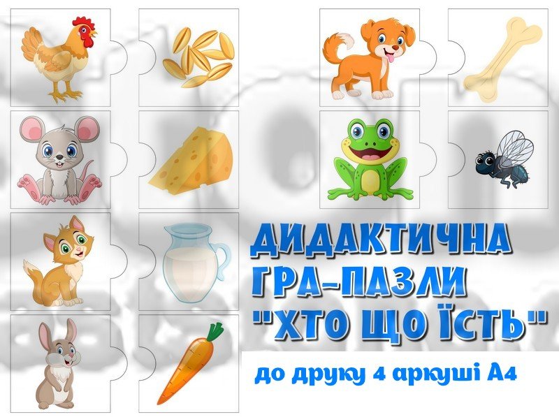 ДИДАКТИЧНА ГРА- ПАЗЛИ ДЛЯ ДОШКІЛЬНЯТ “ХТО ЩО ЇСТЬ”