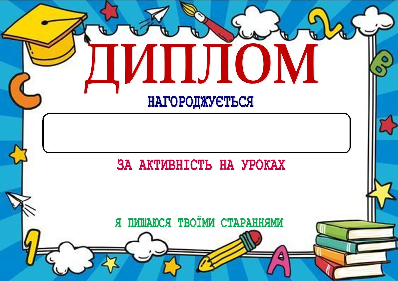 10 видів дипломів. Дипломи за успіхи дітей є чудовим інструментом для заохочення, визнання та мотивації. Вони відіграють значну роль у формуванні самооцінки дитини, її ставлення до навчання та розвитку.Використання дипломів є простим, але ефективним способом підтримати дітей на їхньому шляху до розвитку та успіху, а також сформувати у них розуміння цінності кожного члена суспільства.