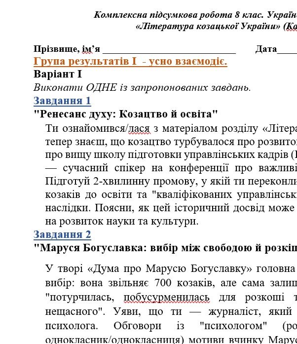 ГР 1. Підсумкова (діагностична) робота з української літератури для 8 класу НУШ “Література козацької України”. МНП Яценко, підручник Калинич
